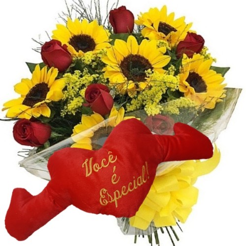 Buquê 8 Girassóis e 8 Rosas Vermelhas+Coração Você é Especial Tam:65x30cm