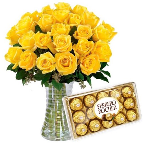 ARRANJO NO VASO G COM 24 ROSAS AMARELAS + CHOCOLATE 12 UN